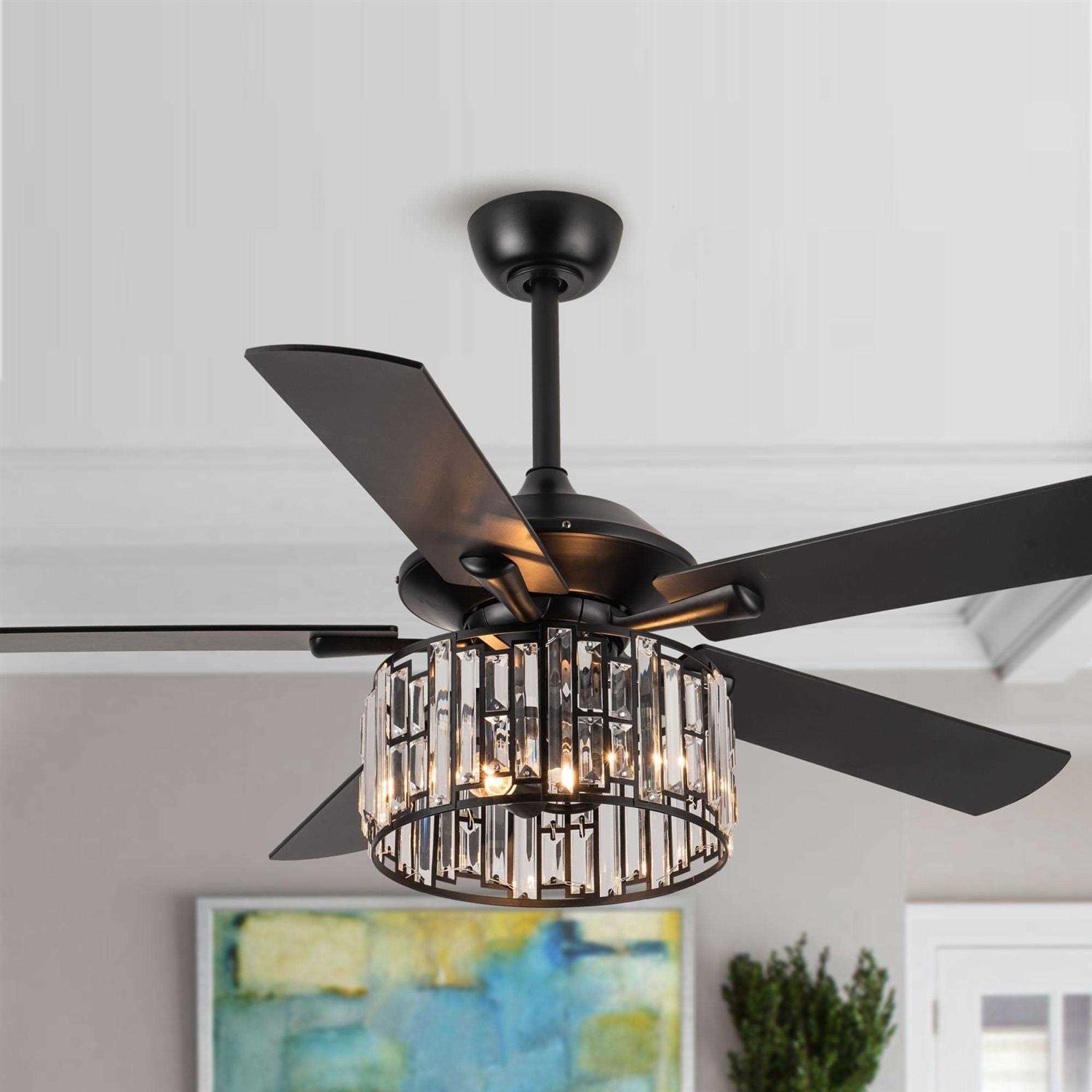 A stylish and cost-efficient option for keeping it cool, this lighted chandelier ceiling fan is the perfect solution for your cooling and lighting needs. A full crystal shade provides your home with a grandeur rarely found in such a functional package. Matching black tone-stained wooden blades move an impressive amount of air. The manual reverse allows this fan to not only cool during the summer but helps keep your rooms warm during the winter. Features: Made of metal and glass crystal Includes one 52-inch, 5-blade ceiling fan Requires two E26 max 40 watts light bulbs (not included) Matte black fixture finish Reversible Blades for black and wood Down-rod mounting Fits sloped ceiling up to 15 degrees Full glass crystal shade 3-speed motor Remote control for easy operation 4-inch and 10-inch down rods included Weighs 20 lbs. Dimensions: Overall: 52 inches diameter x 19 inches tall Canopy: 6 inches diameter x 2.2 inches tall Downrods: 4 inches long and 10 inches long