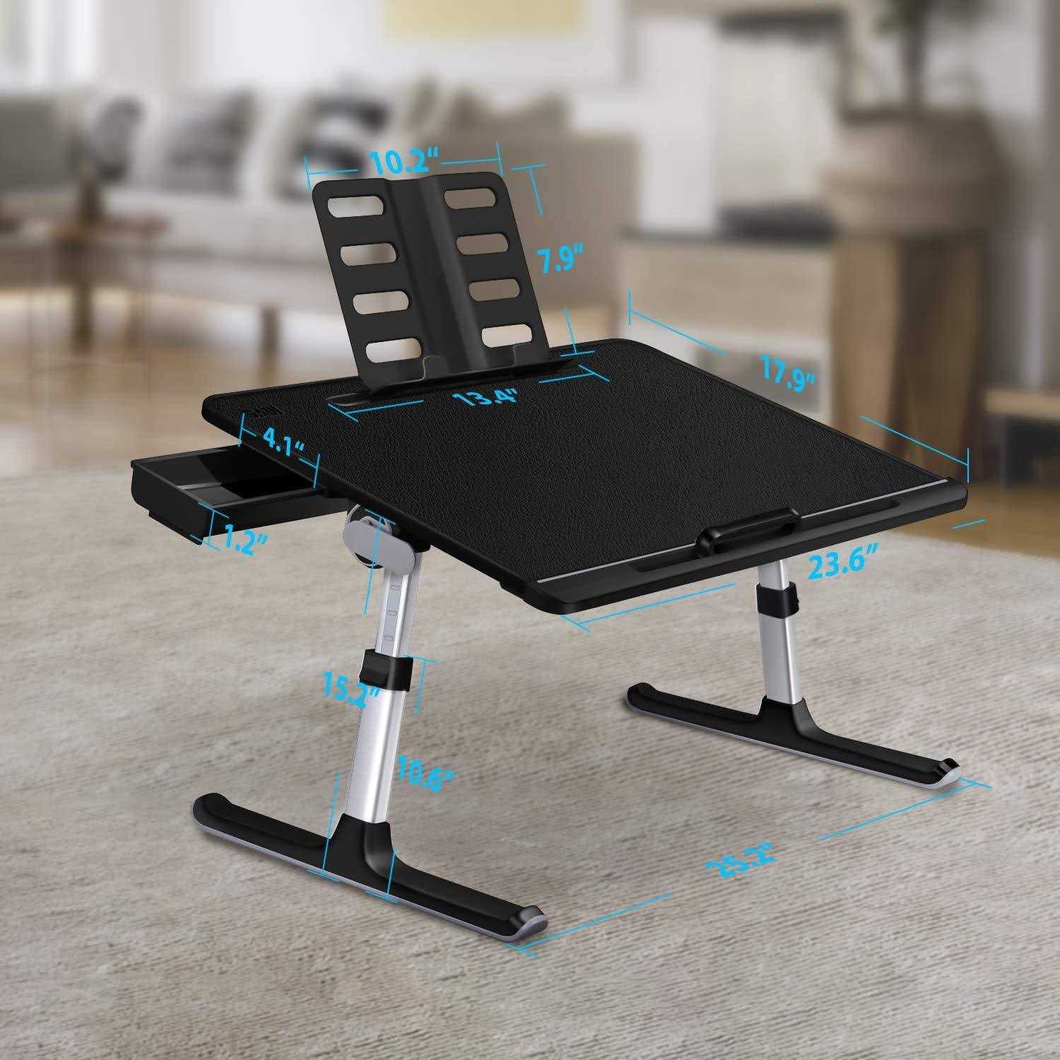 Laptop Bed Tray Table, SAIJI Adjustable Laptop Desk for Bed, Foldable Laptop Stand with Storage Drawer for Eating, Working, Writing, Gaming, Drawing (X-Large,Black)[ADJUSTABLE BED TRAY]: Two auto-lock buttons on each side easily enable quick changes in height, legs can be set to 5 different heights (adjustable from 10.6 – 15.4 ) in addition two clamps may be used to adjust the surface angle, surface can be set to 3 different angles (from 0 deg. -36 deg. ).[ FASHION BED TABLE]: A detachable mouse